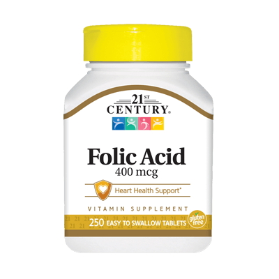 21st Century Folic Acid — фолієва кислота (вітамін В9) у зручній таблетованій формі. Цей вітамін важливий для нормальної підтримки ДНК, зростання та розвитку імунної та кровоносної систем. Прийом добавки жінками під час планування вагітності сприяє нормальному розвитку плода. Комплекс підходить усім фізично активним людям.