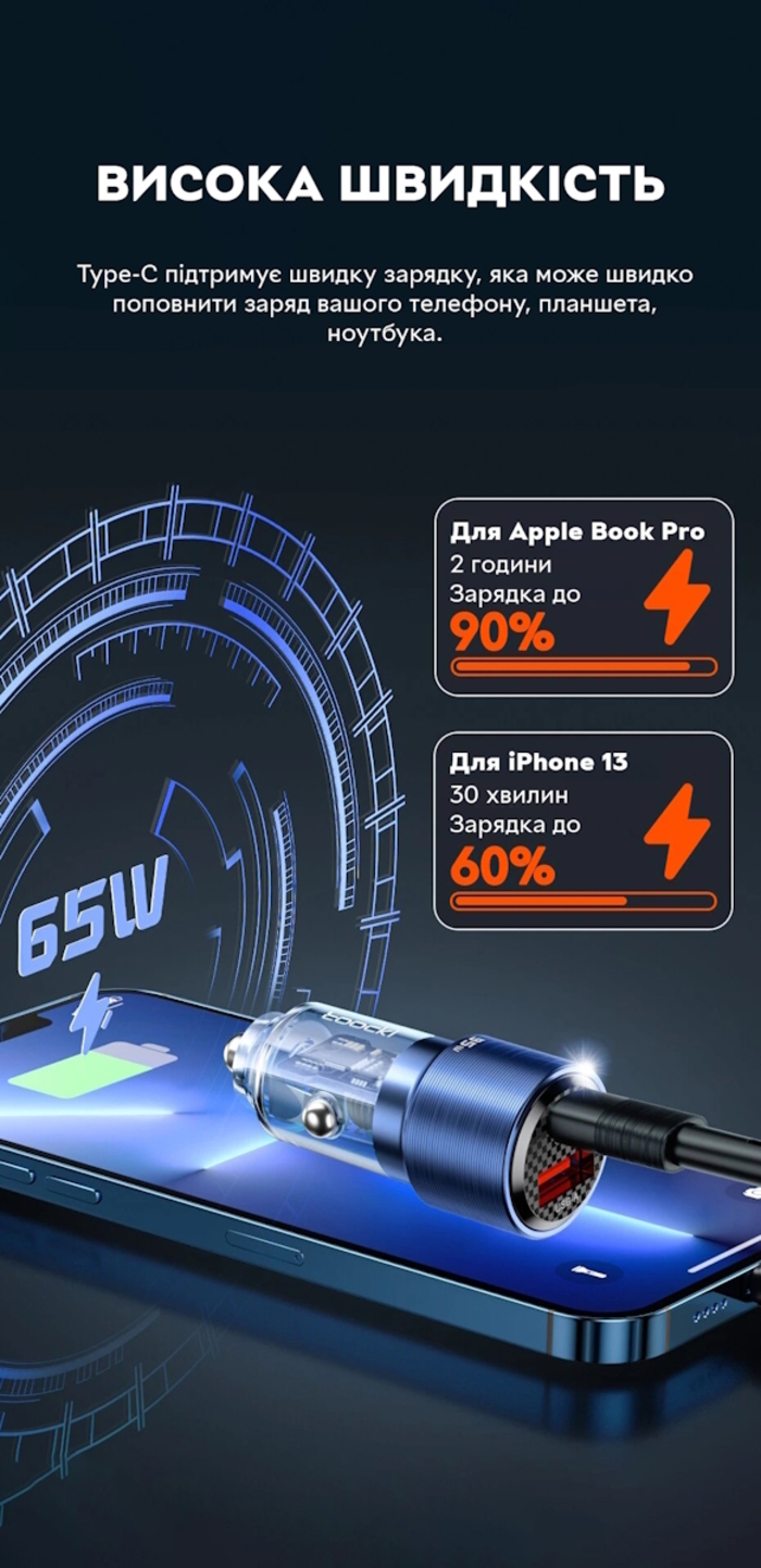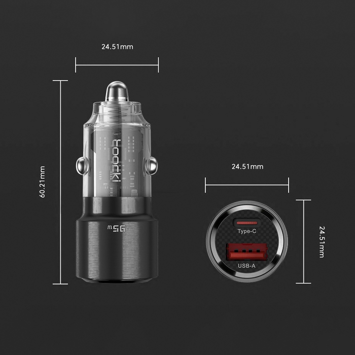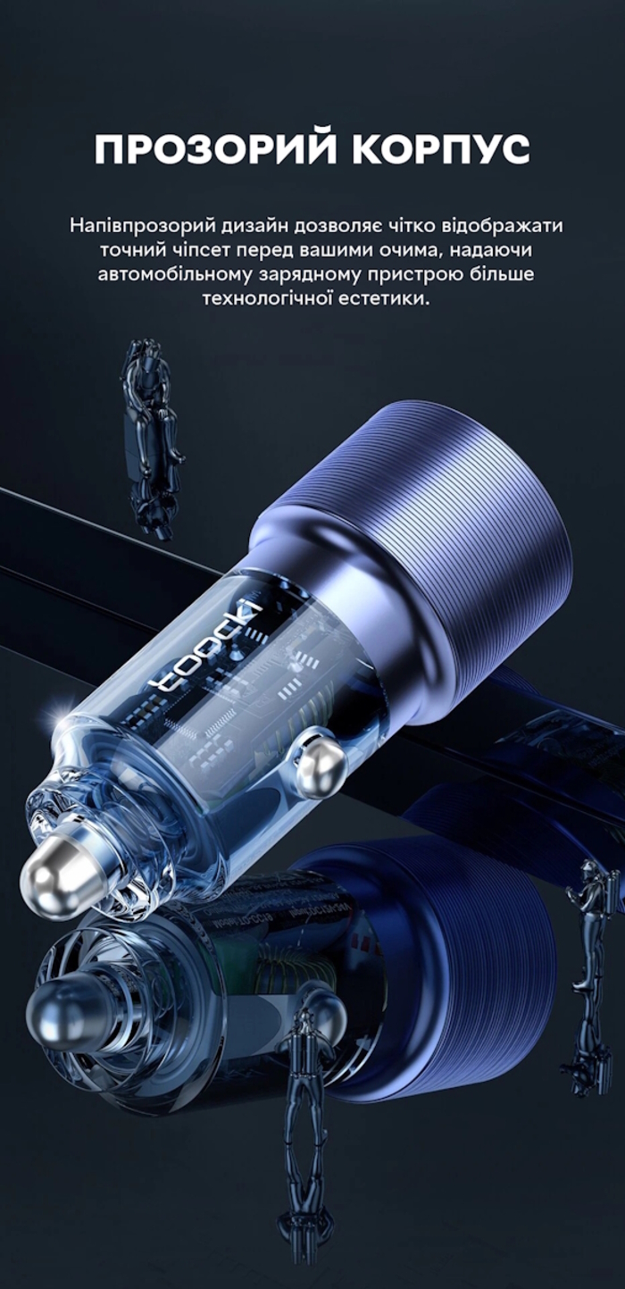 Опис Зарядний пристрій автомобільний в прикурювач Toocki 95W (1 Type-C 65w + 1 USB 30w), Black Transparent