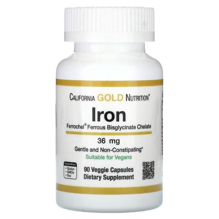Характеристики Хелат бісгліцинату заліза California Gold Nutrition Ferrochel Iron Bisglycinate 36 mg, 90 вегакапсул