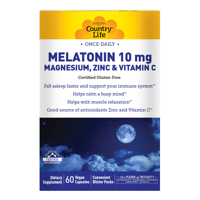 Country Life Melatonin 10 mg Magnesium, Zinc & Vitamin C – це комплексна харчова добавка, що містить мелатонін, а також мінерали магній, цинк та вітамін С. Прийом комплексу допомагає швидше заснути та сприяє повноцінному відновленню організму під час нічного сну.