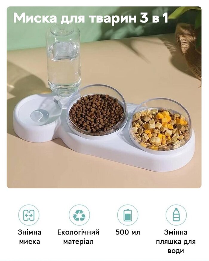 - Дві миски в одному - зручно подавати їжу та воду у одному місці.