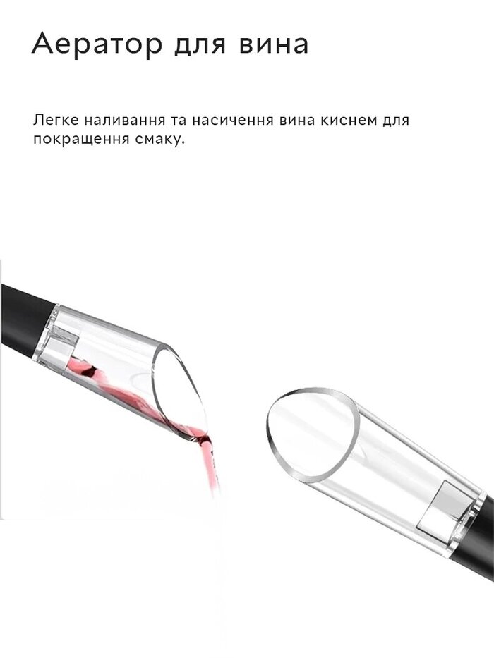 - Аератор – допомагає насичувати вино киснем при наливі, покращуючи його смак.
