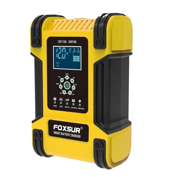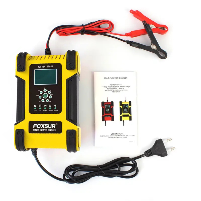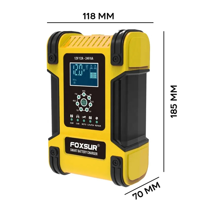 Опис Імпульсний зарядний пристрій Foxsur 12V (24V) потужністю 12 Ah (6Ah) для акумуляторів різних видів 6-200Ah, Black/Yellow