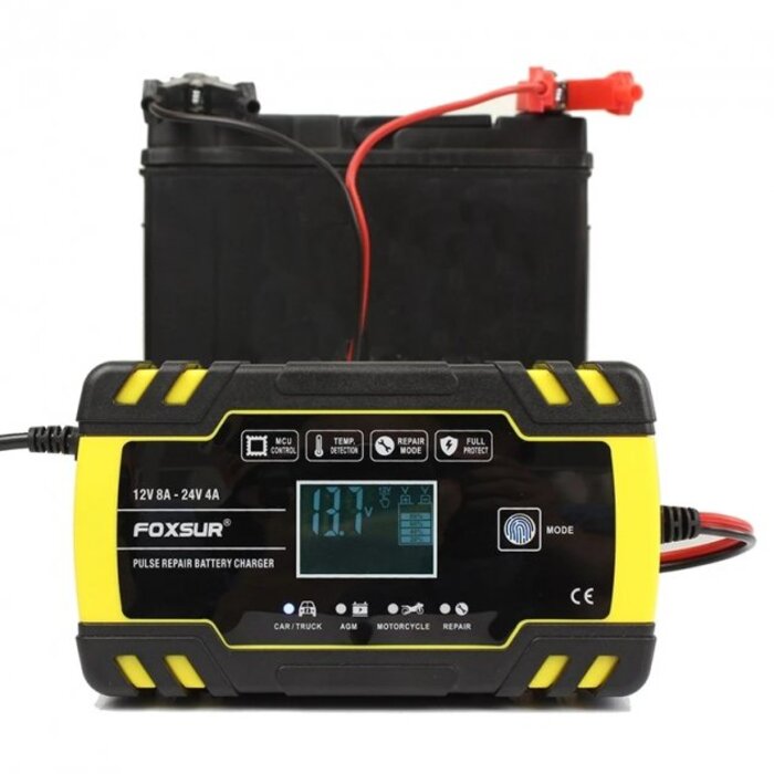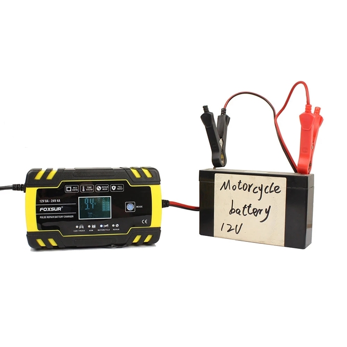 Опис Імпульсний зарядний пристрій Foxsur 12V (24V) потужністю 8 Ah (4Ah) для акумуляторів різних видів 6-150Ah, Black/Yellow