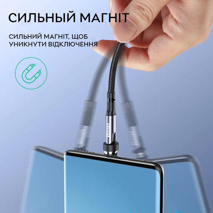 Кабель має магнітний роз'єм, який дозволяє легко та безпечно підключати та відключати пристрої від кабелю. Завдяки своїй конструкції кабель може повертатися на 540 градусів, що забезпечує додаткову гнучкість при використанні.