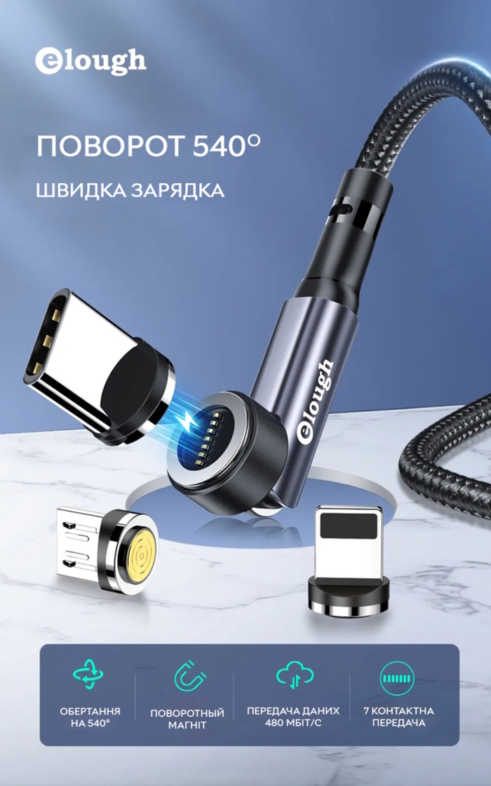 Відгуки Кабель магнітний із швидкою зарядкою Elough 7 Contact 3 A 2 м круглий конектор, Green 3 в 1 Micro USB/Lightining/Type C, обертання на 540°