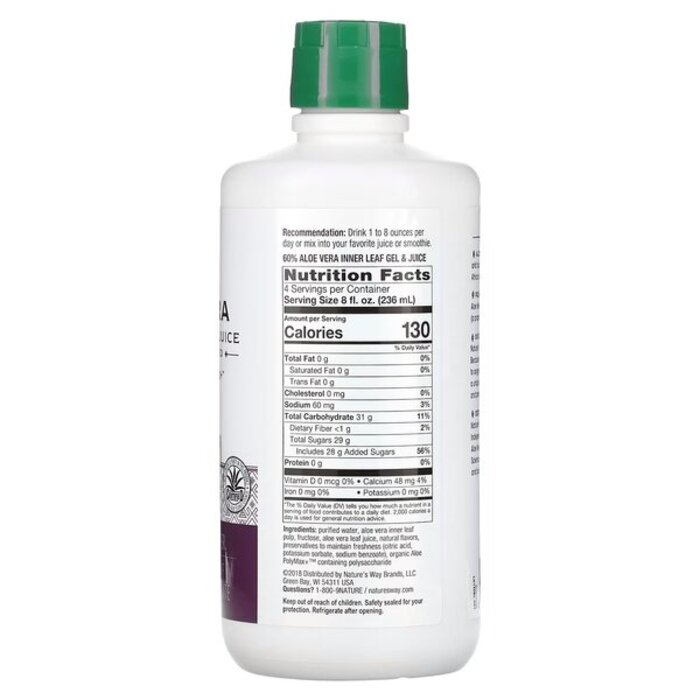 Цей продукт містить органічно вирощене алое віра, зібране на піку живильної активності. Полісахариди відповідальні за багато переваг алое для здоров'я. Алое Віра від Nature's Way збагачений Aloe PolyMax+.