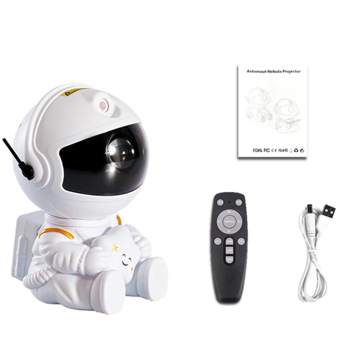 Этот проектор имеет форму астронавта, который надевает на себя скафандр и отправляется в космическое путешествие. Он производит разноцветные лазерные лучи, которые создают на потолке и стенах красивые картины космических объектов, таких как звезды, планеты, галактики и туманности.