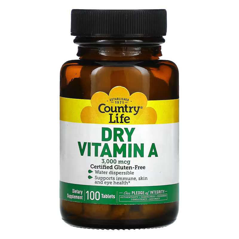 Характеристики Витамины и минералы Country Life Dry Vitamin A 10000 IU, 100 таблеток