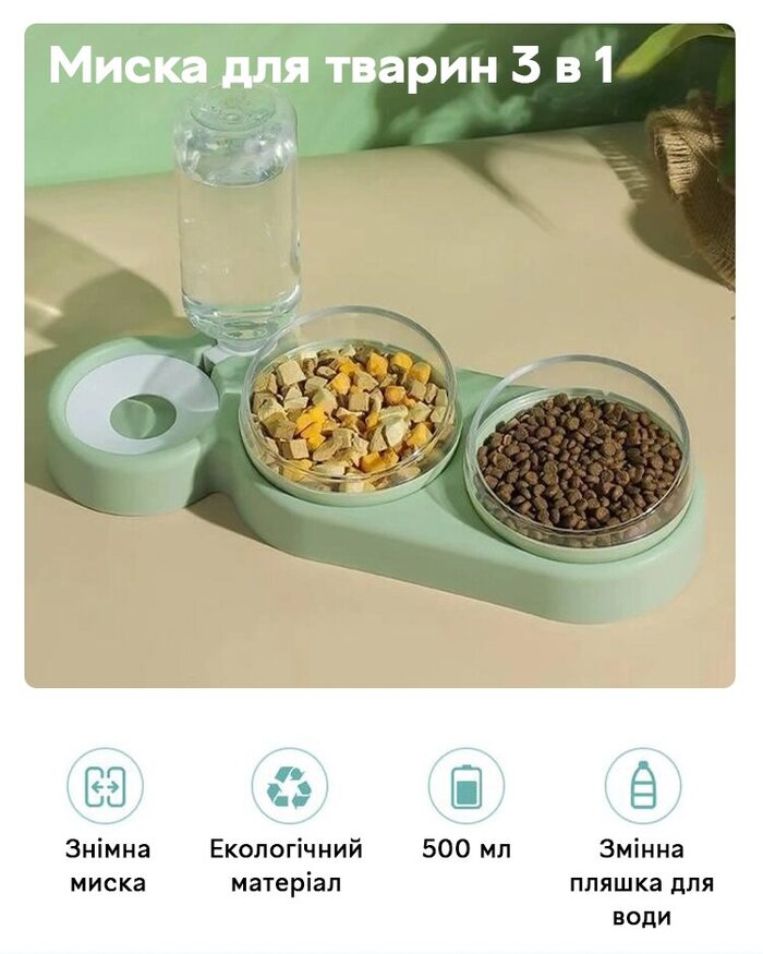 Описание Двойная миска для животных Semi Animal Bowl 13см*38см*22см 500 мл, Light Green с автоматической поилкой