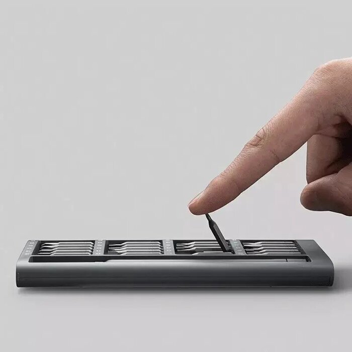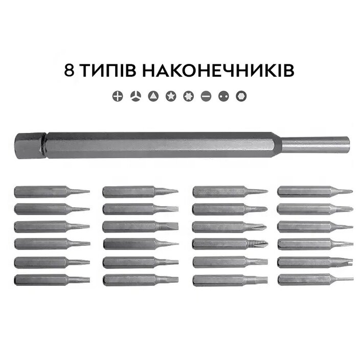 Набор мини отверток содержит 24 различных насадки: плоская отвертка (SL), крестовая (PH), звездообразная (TORX), шестигранная (HEX), вилковая, треугольная. Набор отверток с насадками поставляется в специальном кейсе, состоящем из двух частей: пластиковой крышки и пластиковой подушки для укладки бит, отвертки.