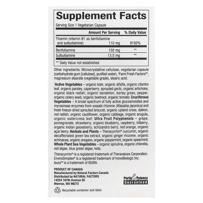 Состав продукта Бенфотиамин и сульбутиамин Natural Factors BioCoenzymated Benfotiamine plus Sulbutiamine, 30 вегакапсул