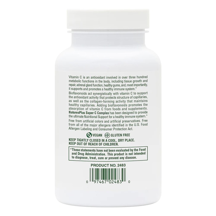 Natures Plus Super C Complex — витамин С в форме вегакапсул, участвующий в более чем трехстах метаболических функциях организма, включая рост и восстановление тканей, работу надпочечников, здоровье десен. Кроме того, он способствует здоровью иммунной системы.