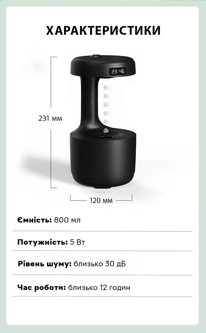 Характеристики Увлажнитель воздуха, портативный аромадифузор Kinscoter DQ-011 Anti Gravity Humidifier 800 мл, Black