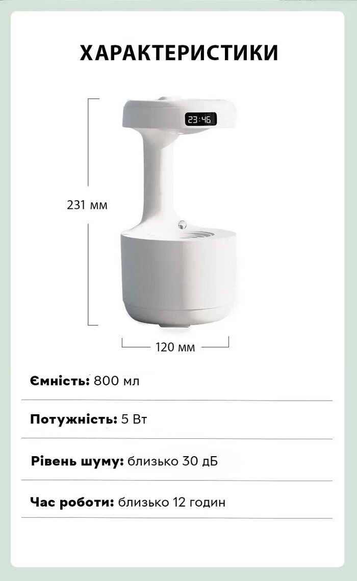 Характеристики Увлажнитель воздуха, портативный аромадифузор Kinscoter DQ-011 Anti Gravity Humidifier 800 мл, White