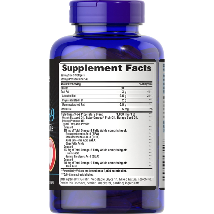 Puritan's Pride Triple Omega 3-6-9 Fish, Flax & Borage Oils – комплексная добавка, объединяющая полезные жирные кислоты из трех различных источников. Продукт разработан для всесторонней поддержки организма и обогащения рациона эссенциальными жирами.