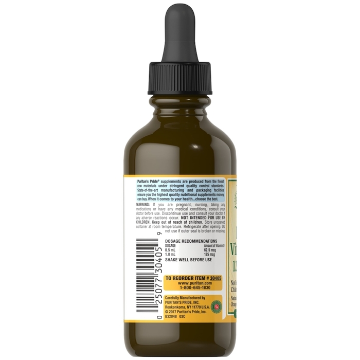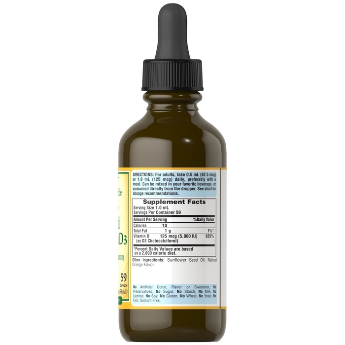 Витамин D3 является важным элементом здоровой жизни и благополучия. Puritan's Pride предлагает вам витамин D3 в жидкой форме с содержанием 5000 международных единиц (МЕ) на дозу. Этот продукт содержит витамин D3, производимый естественно в коже под воздействием солнечных лучей.