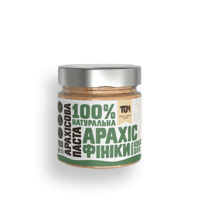 TOM Арахисовая паста с финиками и кокосовым маслом - паста из жареного арахиса от украинского бренда. Эта паста — незаменимый продукт во время массонабора. Также арахис содержит много магния и некоторых витаминов. Подходит всем совершеннолетним людям.