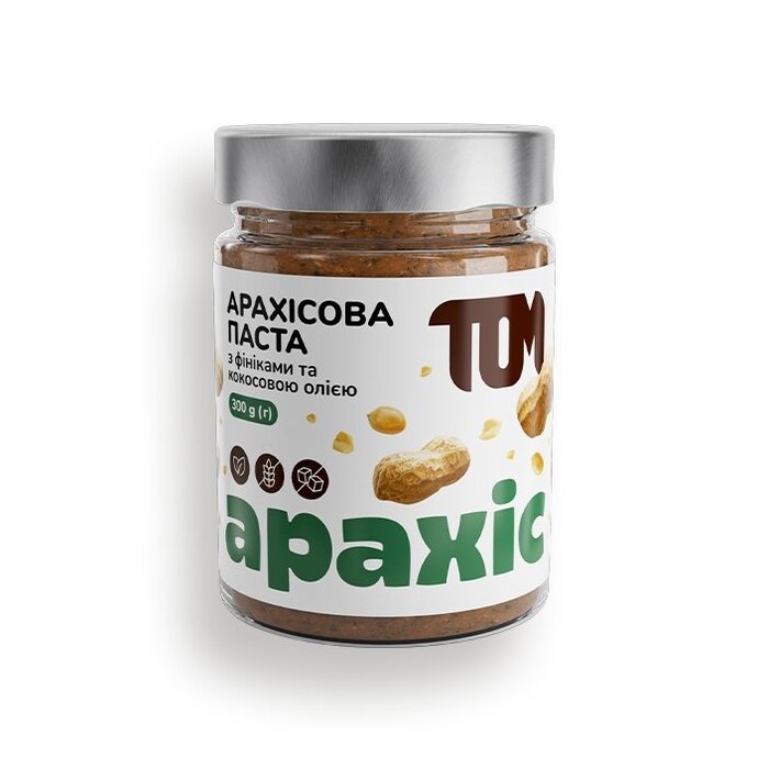 TOM Арахисовая паста с финиками и кокосовым маслом - паста из жареного арахиса от украинского бренда. Эта паста — незаменимый продукт во время массонабора. Также арахис содержит много магния и некоторых витаминов. Подходит всем совершеннолетним людям.