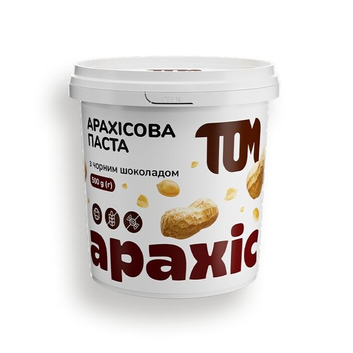 TOM Арахісова паста з чорним шоколадом – паста зі смаженого арахісу від українського бренду. Ця паста – незамінний продукт під час масонабору. Також арахіс містить багато магнію та деяких вітамінів. Підходить всім повнолітнім людям.
