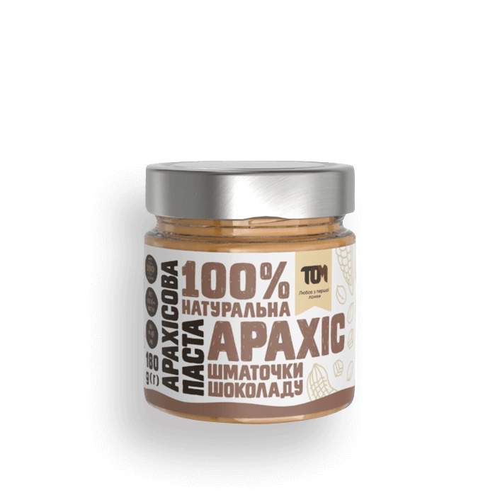 TOM Арахісова паста зі шматочками чорного шоколаду – паста зі смаженого арахісу від українського бренду. Ця паста – незамінний продукт під час масонабору. Також арахіс містить багато магнію та деяких вітамінів. Підходить всім повнолітнім людям.