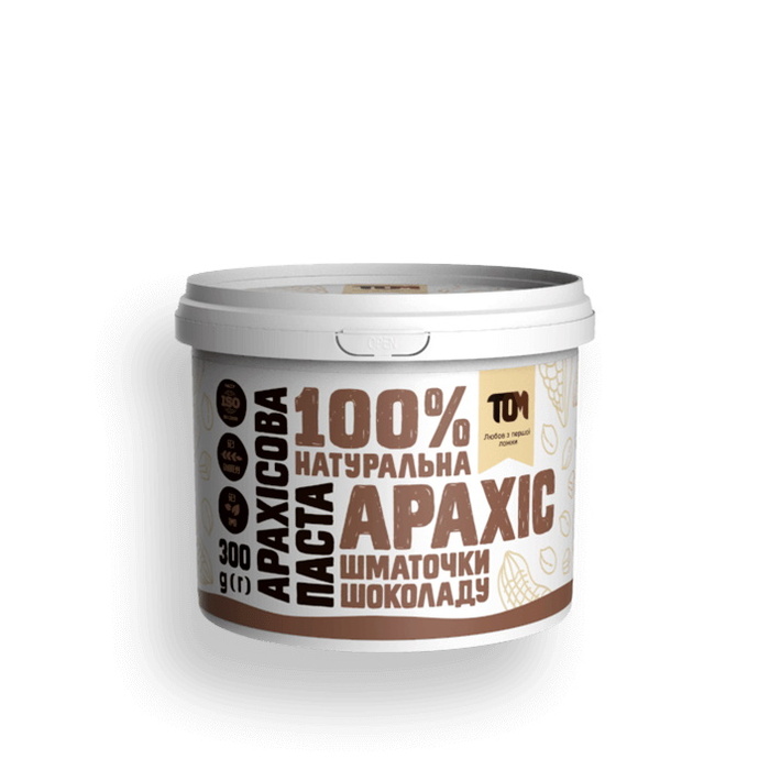 TOM Арахісова паста зі шматочками чорного шоколаду – паста зі смаженого арахісу від українського бренду. Ця паста – незамінний продукт під час масонабору. Також арахіс містить багато магнію та деяких вітамінів. Підходить всім повнолітнім людям.