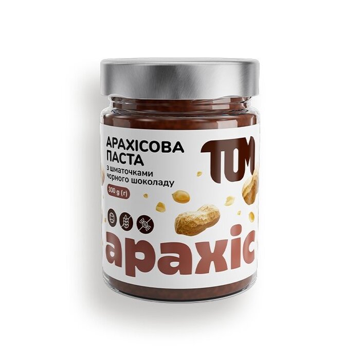 TOM Арахісова паста зі шматочками чорного шоколаду – паста зі смаженого арахісу від українського бренду. Ця паста – незамінний продукт під час масонабору. Також арахіс містить багато магнію та деяких вітамінів. Підходить всім повнолітнім людям.